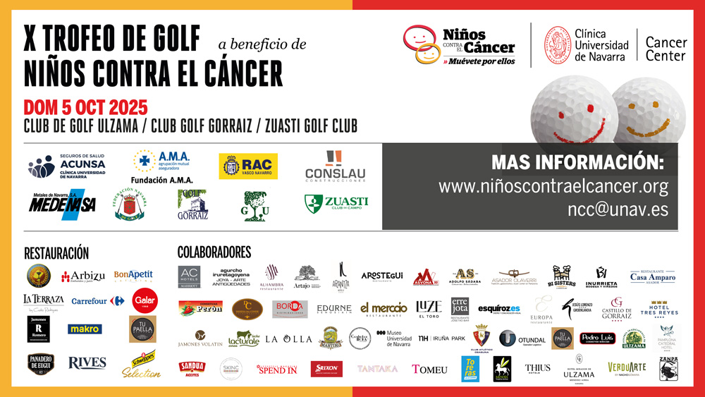 23 de septiembre de 2025.- La décima edición del Trofeo de Golf organizado por Niños Contra el Cáncer, el programa social de la Clínica Universidad de Navarra, se celebrará el próximo domingo 5 de octubre en las instalaciones de los clubes de golf de Gorraiz, Ulzama, y Zuasti. Las inscripciones para el evento, que incluyen un welcome pack, un aperitivo, un sorteo de regalos y un cocktail, ya se encuentran abiertas a un precio de 45 euros.